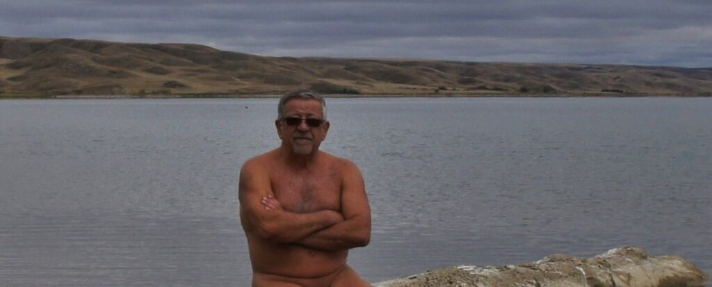 Two days ago, I went down to the Landing in the late afternoon and got a few photos such as this one, of me standing on a log at the edge of Diefenbaker Lake. It was a gloomy day, but I didn’t let that stop me from taking advantage of basically being nude, especially when there was no one else to be seen in the Provincial Park. I got to wander along the shore of the lake, far from any late fall traffic. It was quite cool out, however that didn’t stop me from being at one with nature.