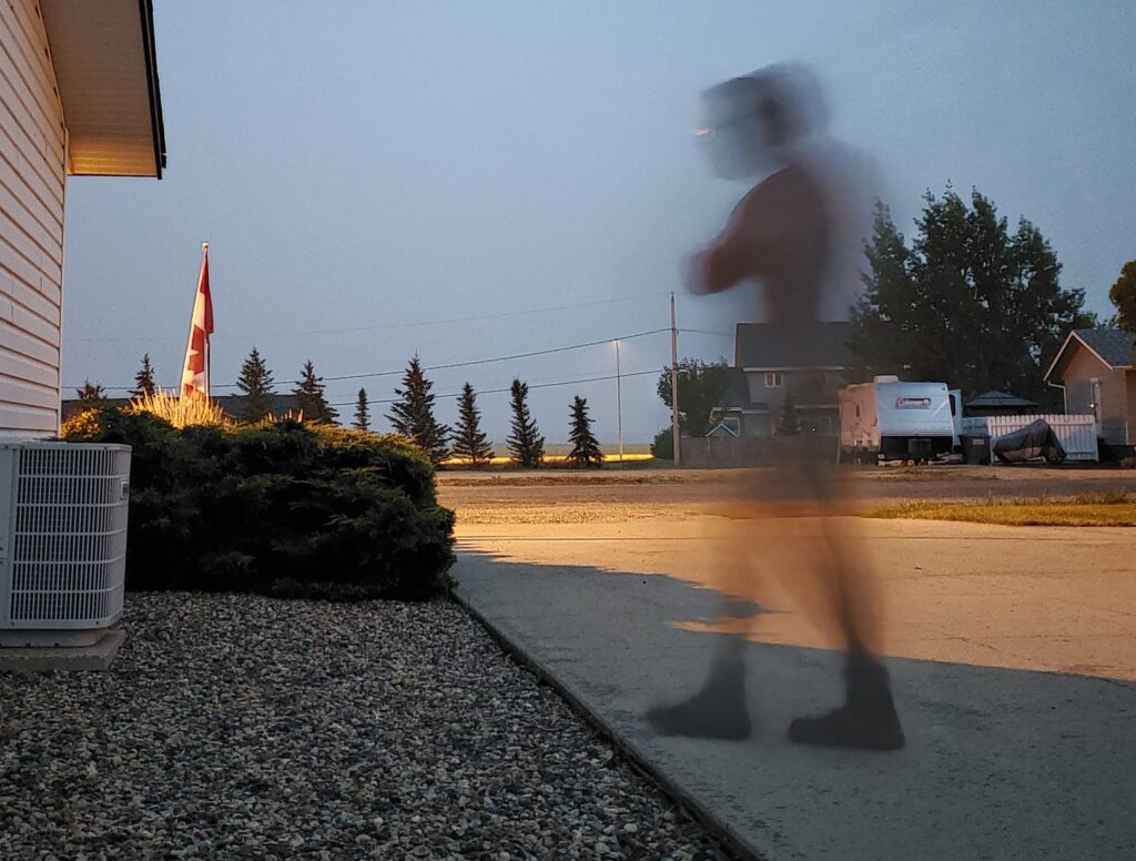 The forecast promised a good amount of rain today. So far, not much has shown up. One thing with the forecast that has been right is the warmer morning temperature of 12C. I got outside at 6:30 as soon as the first drops of a shower began to fall. I was hoping to capture myself being drenched with rain. Because it was still darkish, with dawn not yet arrived, I had set my camera to night mode.