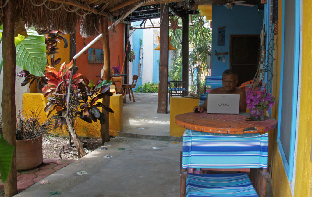 We are now in Puerto Morelos at Casa Sorpresas. My wife took a photo of me at my writing table located on the patio outside of our door. The owner lives in the front half of the house while we have the back portion including the high-walled yard. It is perfect. The owner, a woman called Kim, spends the day at her real estate office which means that I can be nude whenever she is away. I brought up the question of being able to be nude and she gave permission for me to treat the private yard as a nude sanctuary.
