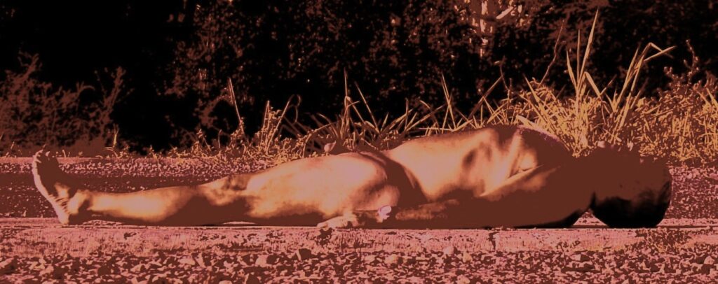 I went outside of the compound for a mid-afternoon walk earlier today, a solo expedition. I wanted a specific kind of image that I could use to write up a series of posts on Alchemy for my Jungian Lens blog site, a place that I had been posting to quite regularly for more than a year. However, I hadn’t thought it would be an image of me nude. When I saw this location which was quite surrounded by brush, I took advantage of it to take a photo with me nude.