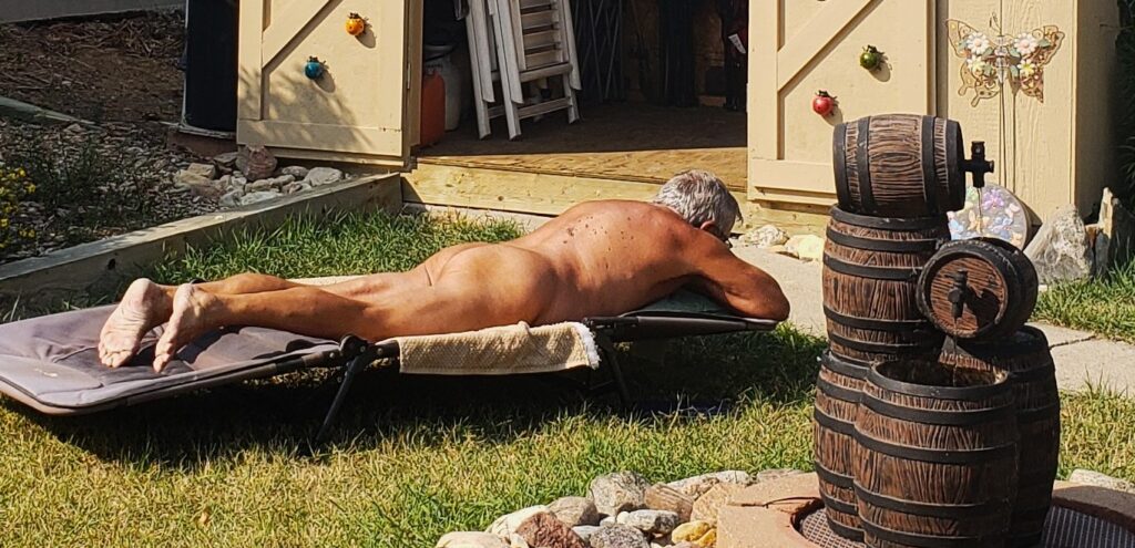 Once the apples were picked and disposed of, I used our electric grain mill to grind some whole wheat flour in the yard. I didn’t have to worry about flour getting all over my clothing since I could do this while clothing free. Then, it was time for a cup of tea while sitting in a protected corner of the yard, in front of our garden shed. Naturally, my chair was positioned so that I could feel the sun’s rays over as much of my body as possible. With the coming of winter in the foreseeable future, I have to take advantage of this as much as possible.