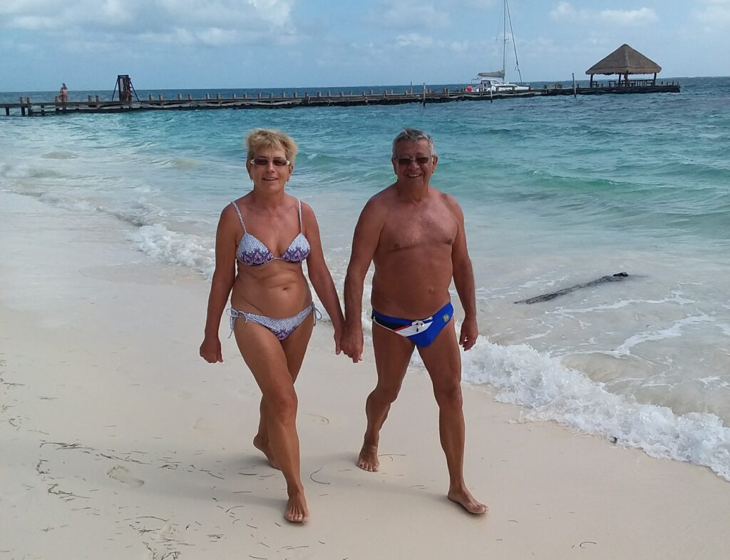 New Year’s Day morning was good– coffee on the patio with me nude as usual. Meditation followed before we had breakfast on the patio. With the forecast not promising, we decided to try a morning walk along the beach, a walk that was cut short because the clouds began to gather and darken. We only made it as far as the clothing-optional beach in front of Desires where I got a worker there to take our photo. We hope to get out again later this afternoon if the weather improves as promised.