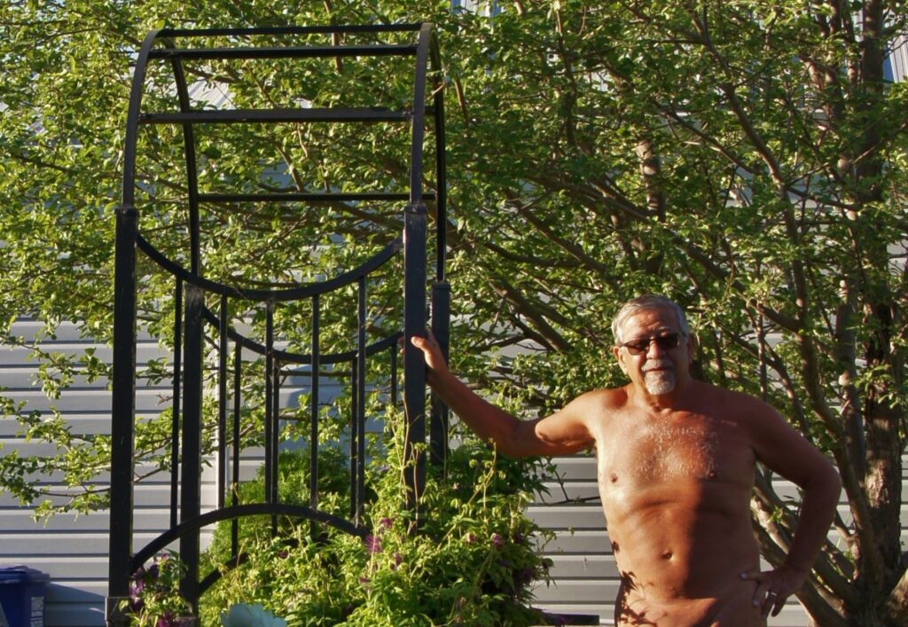 In the photo above a few days ago, I was in my neighbour’s yard. I strayed out of my own yard. Was this a form of cheating on my wife, to potentially allow another woman to see me nude? This neighbour has seen me nude a number of times while I was in my own yard. On those occasions I didn’t even think such a thing. And then, I reread Sharp’s book, Not the Big Sleep.