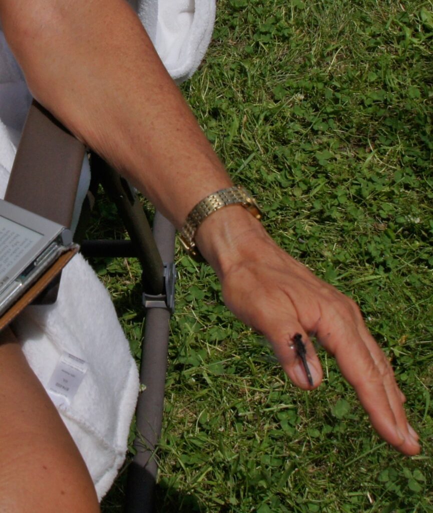 The time we spent at Green Haven as a couple seemed to be good for both of us. She appeared so relaxed as she showed no signs of discomfort while being nude among other people. She almost seemed to be more at ease with her nudity than a few of the women who lived at the naturist site during the summer. I took photos of her with dragonflies resting on her with her permission. Of course, the image was cropped to preserve her identity.