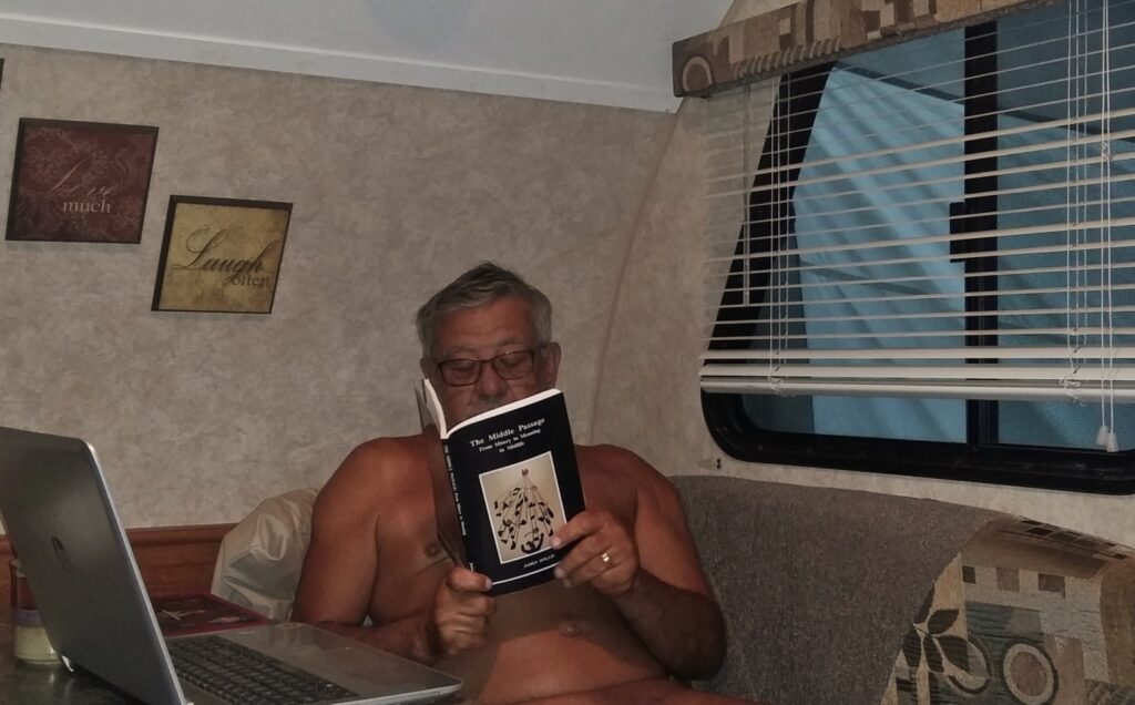 I am sitting in my tiny camping trailer while a gentle rain falls outside. The temperature has fallen to single digits and the breeze is brisk. It definitely isn’t the most pleasant situation for me to go out for a nude walk. I tried and the walk was shortened as I hurried back to my warm, tiny trailer. There is no Internet here at Green Haven, so I spend most of my time writing, taking occasional breaks to read.