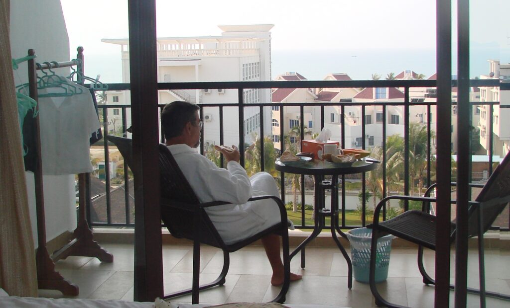 My time for being nude is limited by me, to time spent on the balcony. There weren’t any nude photos taken by my wife [I don’t take them of myself] so I am only bringing a photo taken where I am nude beneath the dressing gown. I did get to do an evening skinny dip in the South China Sea thus keeping my record for skinny dipping in every suitable location possible. I did, however, get a photo of three youths doing this during the day time.