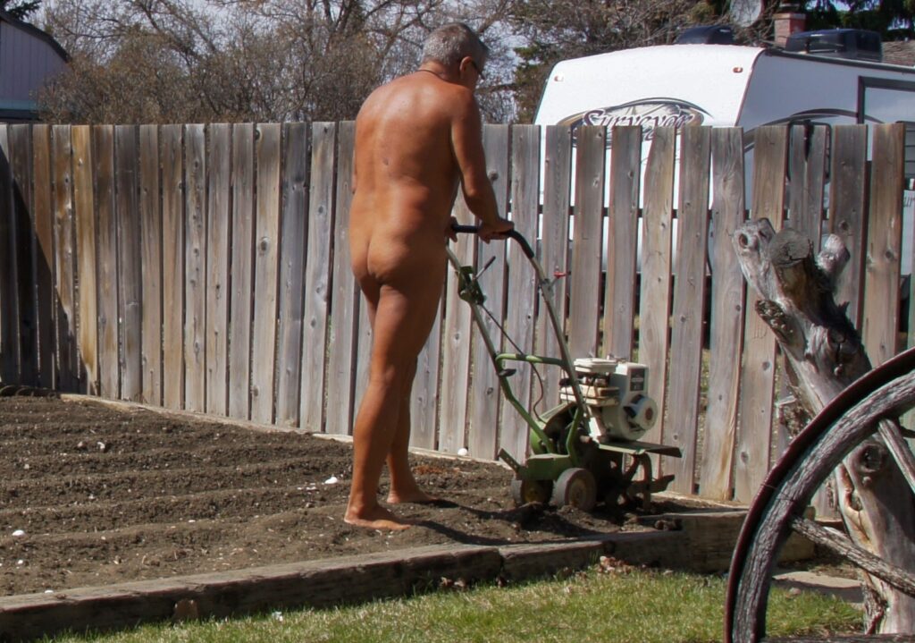 It’s that time of year again, a bit earlier than last year, for getting the garden ready for planting. I tilled the garden last autumn while dressed as I am in this image. I am not so sure that I will till “au naturel” this year as a number of my neighbours seem to be busy outside in location where they would easily spot me and be horribly shocked by nudity. Still, that wasn’t a factor in prepping the tiller, making sure it was filled with gas, and placing it in the garden in my birthday suit.