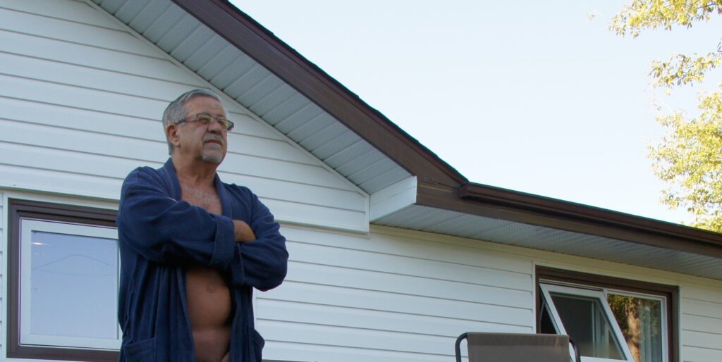 This is not the best kind of image for promoting the philosophy of naturism. However, it is a very real image of how one copes with the weather here on the prairies this morning. It was only 8 Celsius with a breeze and very heavy dew when I took this photo of myself. I was outside before the sun’s rays had reached our back deck which meant that I chose to wear a robe.