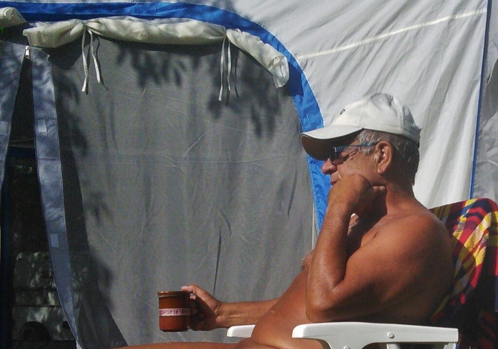 I chose this photo today, a scene from our time spent at Green Haven. The image was taken before another permanent resident of the naturist site came over to have a cup of coffee with my wife and I. He is definitely one of the walking wounded who make the place home. I didn’t get a photo with him as I don’t care to break community rules regarding photography.