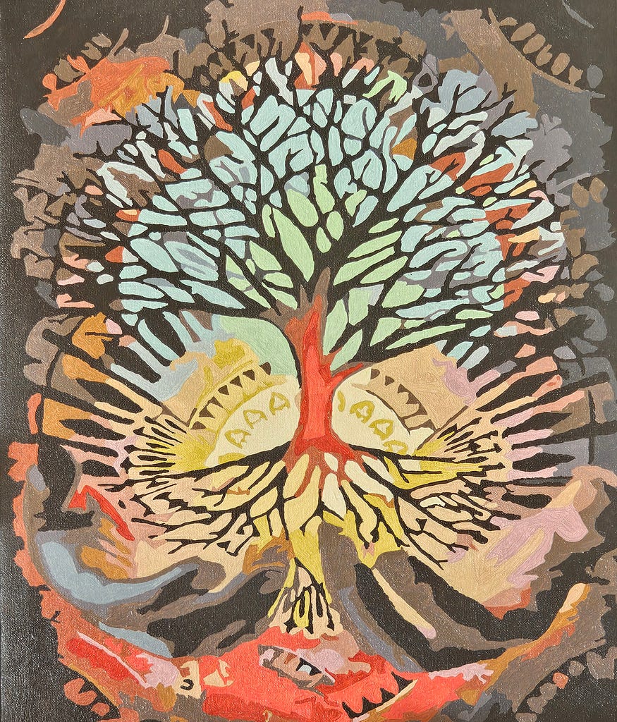 The tree stood at the centre, glowing softly, its branches and roots weaving patterns that made her breath catch. The colours around it moved in slow spirals, as though the world were exhaling in her direction. And the hands, those immense, gentle hands held the tree with a tenderness that made her chest ache.