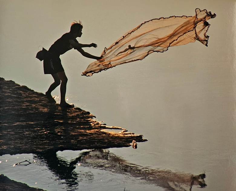 He lifted his net and cast it in a wide, practiced arc. The net opened above him like a breath released, then settled onto the water.